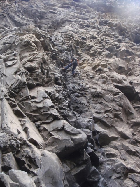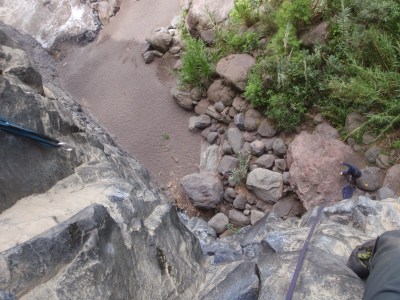 So we continued moving down the crag, and up in grade, towards the river. The last route we did was 50 meters long of sustained, tough climbing. Here is pic of my guide rappelling back down: