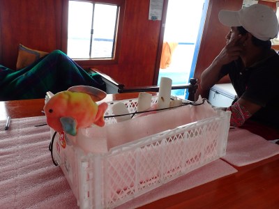 On top of the rough conditions, the large corals at these islands that we want to sample are unfortunately also deep. Typically corals that we sample are in shallow water, but here the big ones are found around 50 feet. This not only means lots of compression hosing, but it also means that lots of nitrogen buildup in our bodies. With 3 to 4 hour long dives per day (dawn pre-breakfast dive, after breakfast dive, and 1-2 afternoon dives), we’re all pushing our decompression limits every day.