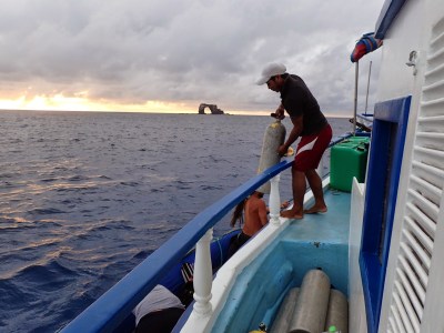 | Loading the scuba tanks for our dawn dive. Photo by Gloria Jimenez |