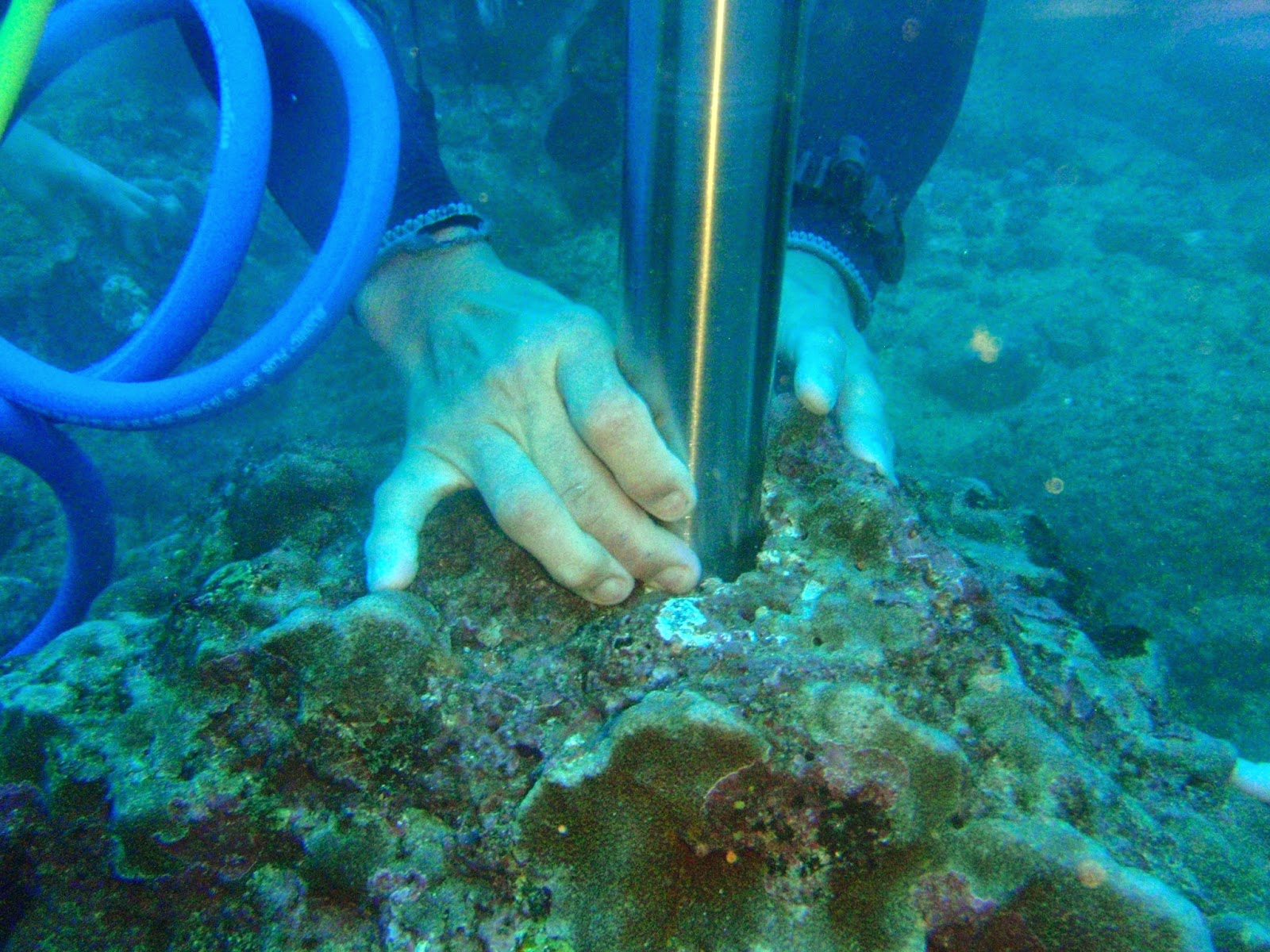 After coring, we fill the holes we create with cement plugs that prevent other organisms from coming in and killing the corals from the inside. These plugs also provide a surface for the coral to re-grow, and many have documented the recovery of corals cored in this way. But I was excited to see this for myself. You know, to sleep at night…