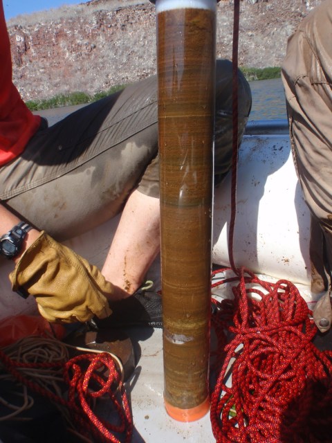 | Close up of a sediment core from Genovesa crater lake, showing the distinct layers of sediment. Photo credit: Diane Thompson |