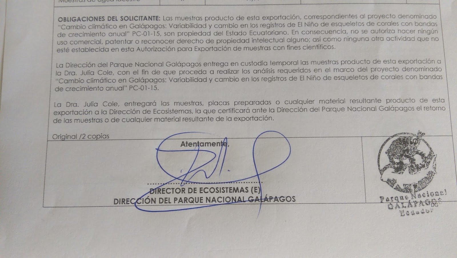 Our sample export perrmit, signed and stamped by the Galapagos National Park